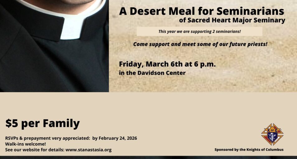 Come and help our Knights of Columbus support our Seminarians (future priests)! Enjoy a Lenten Dinner on Friday, March 6th at 6 PM in the Davidson Center.$5 per family You…Read More >