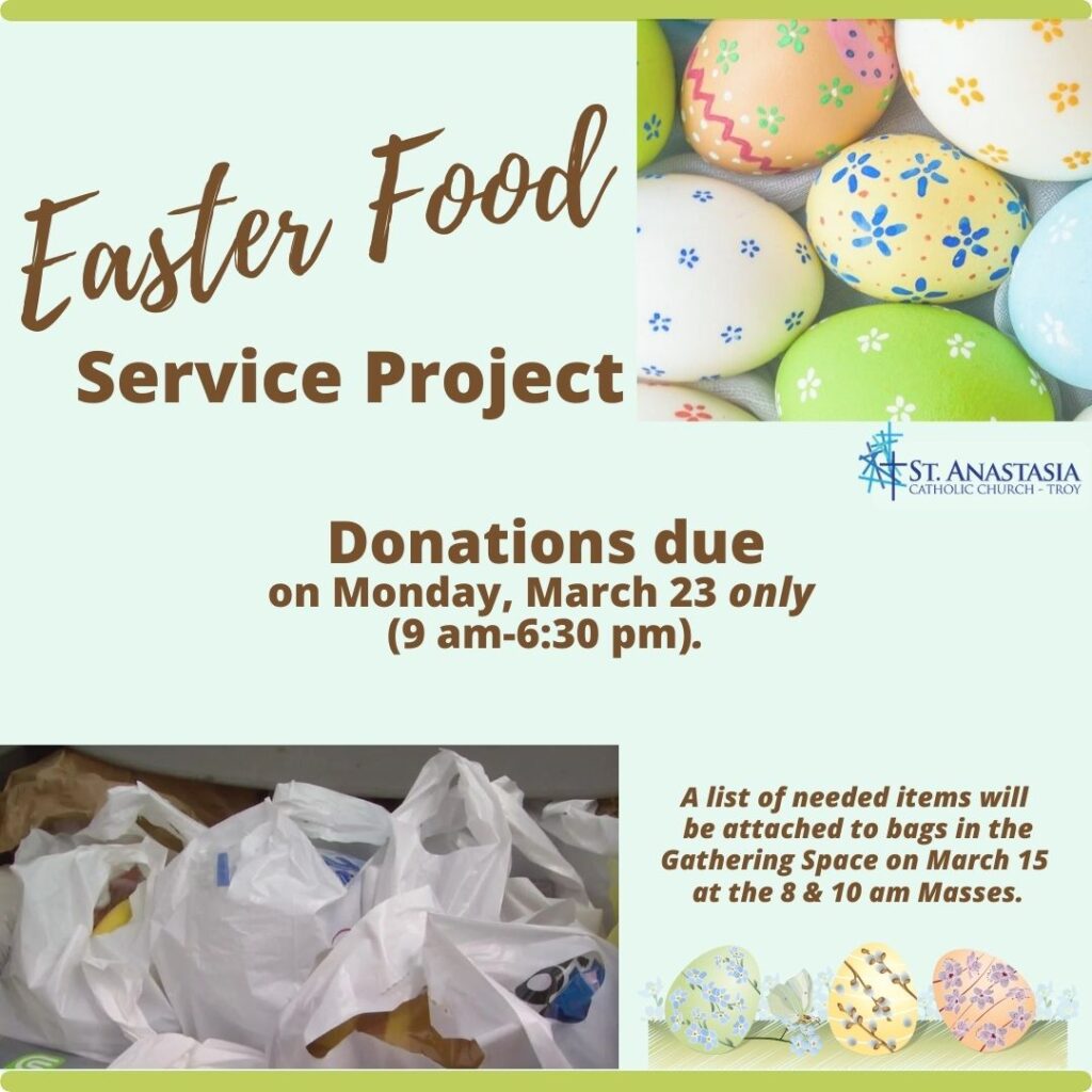 Lists of needed items & bags will be available in the Gathering Space on Sunday, March 15 at the 8 & 10 am Masses.