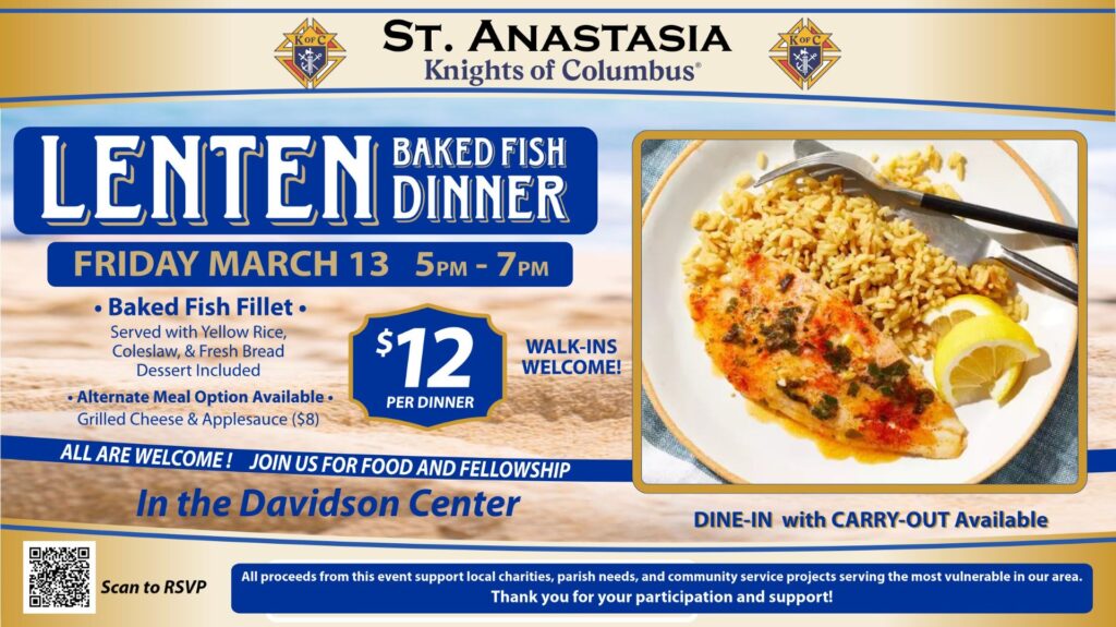All are welcome to join us for a delicious Lenten meal while supporting our Knights of Columbus and the many great charities they support.